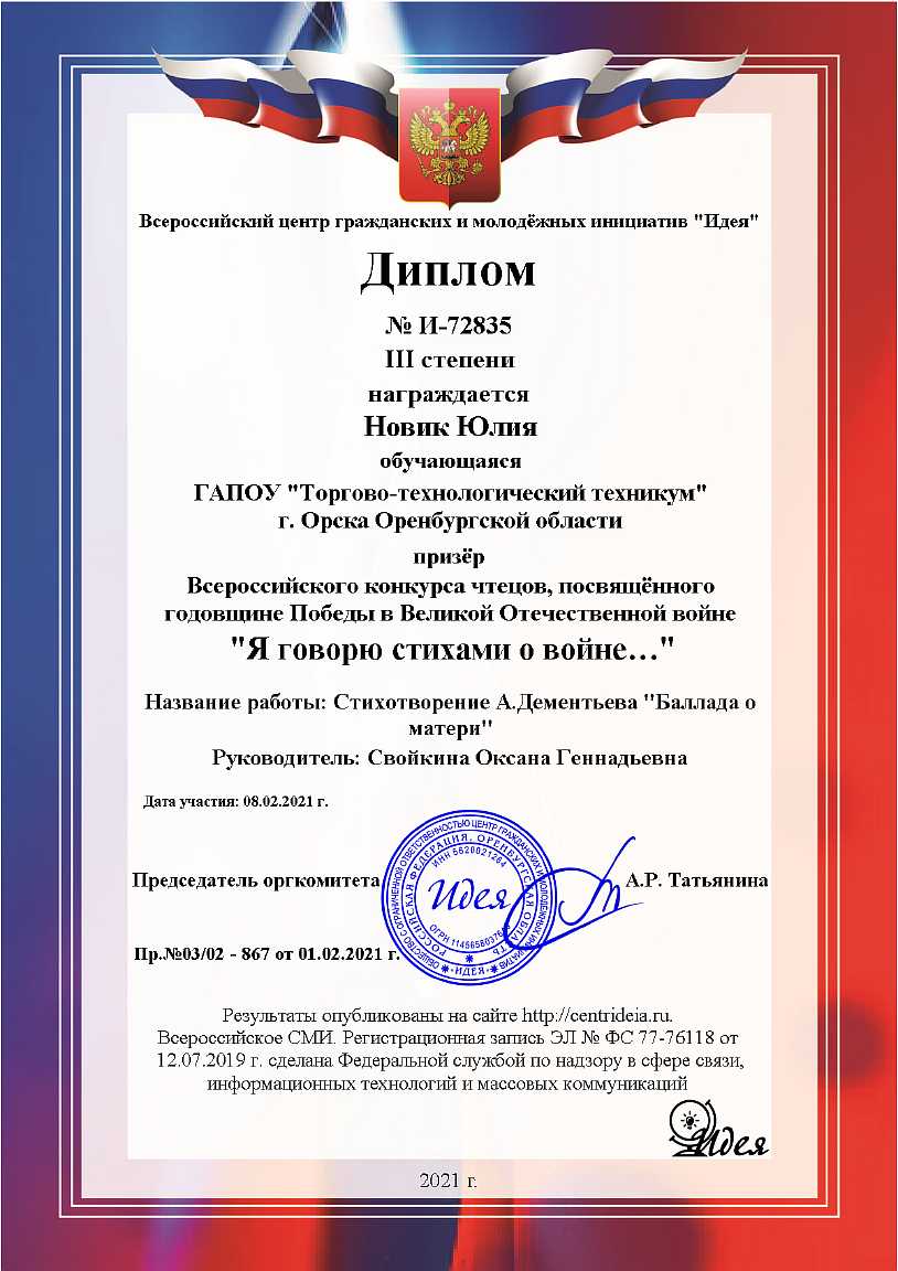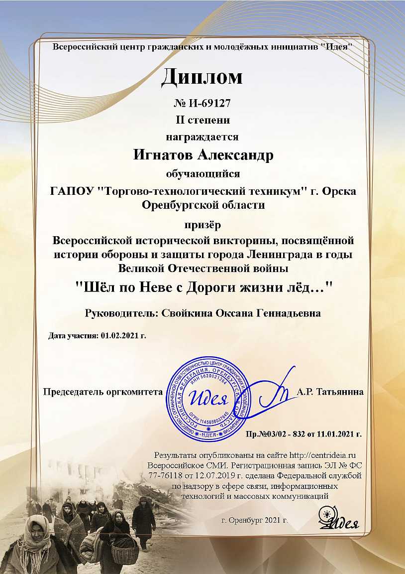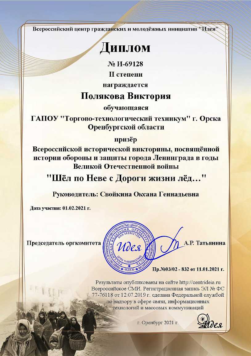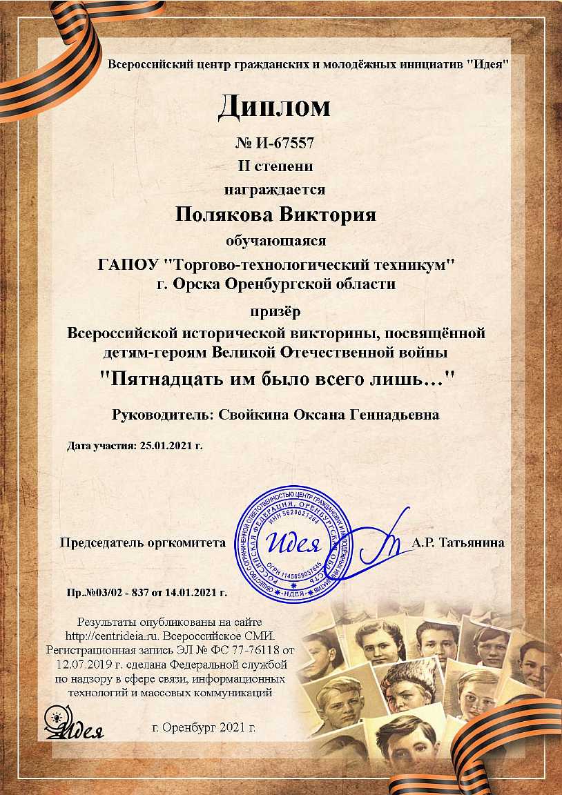 ( 0 Голосов ) С27 января по 20 февраля 2021 года ГАПОУ «Торгово-технологический техникум» г. Орска в рамках проведения месячника оборонно-массовой, военно-патриотической работы преподаватель-организатор ОБЖ Свойкина Оксана Геннадьевна и наши обучающиеся: Игнатов Александр, Полякова Виктория - 18 группа по профессии 43.01.09 Повар, кондитер, Плаксина Екатерина - 26 группа по профессии 43.01.09 Повар, кондитер и Новик Юлия - 34 группа по специальности 38.02.01 Экономика и бухгалтерский учет (по отраслям) приняли активное участие в онлайн викторинах и конкурсах. Организатором выступил Всероссийский центр гражданских и молодёжных инициатив «Идея». Ребята награждены дипломами II и III степени. Поздравляем наших участников!