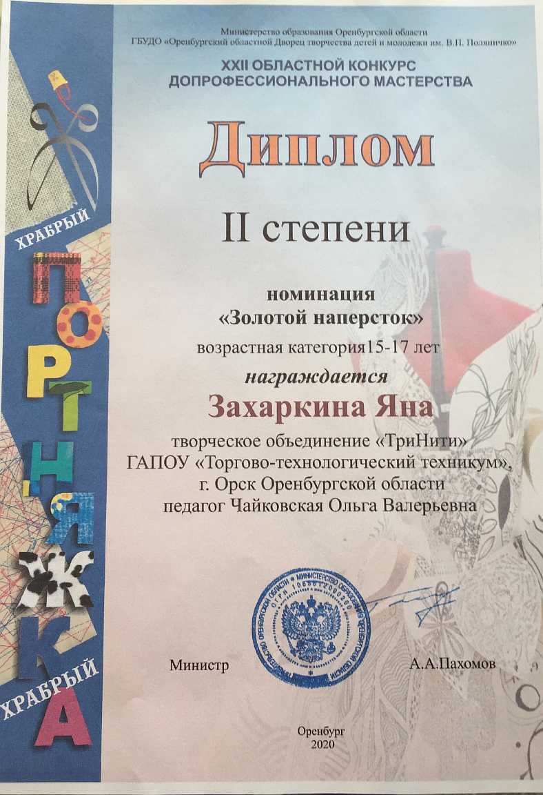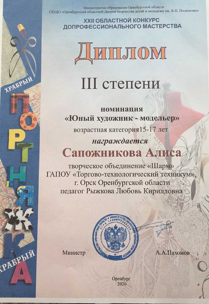 Обучающаяся ГАПОУ «Торгово-технологический техникум» г. Орска творческое объединение «ТриНити» - Захаркина Яна, педагог Чайковская Ольга Валерьевна - награждены дипломом II степени в номинации - «Золотой напёрсток». Обучающаяся ГАПОУ «Торгово-технологический техникум» г. Орска творческое объединение «Шарм» - Сапожникова Алиса, педагог Рыжкова Любовь Кирилловна - награждены дипломом III степени в номинации - «Юный художник - модельер». Поздравляем! Желаем участникам успехов и радости! |