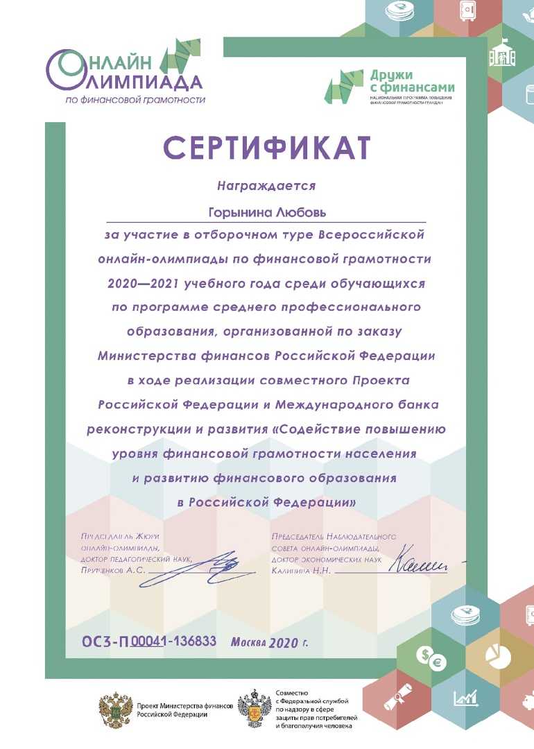 ( 0 Голосов ) Всероссийская онлайн олимпиада по финансовой грамотности проходила в период с 16.09.2020 по 28.10.2020года, участие приняли обучающиеся нашего техникума группы 24 Борцова Карина и Горынина Любовь. Олимпиада проходила в 2 тура: 16.09.2020-30.09.2020 года проходил отборочный тур, обе студентки успешно выполнили предлагаемые задания и перешли в заключительный тур: 14.10.2020-28.10.2020 года был проведен заключительный тур, участницей которого стала Горынина Любовь. Итоги заключительного тура подведены 11.11.2020 года, по результатам Горынина Любовь стала призером, заняла 2 место! Поздравляем! Желаем новых успехов и побед!