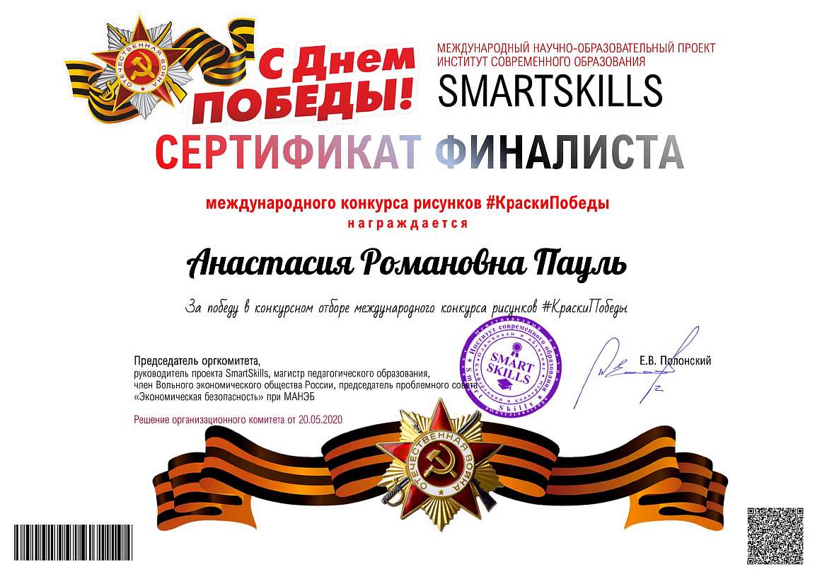 ( 0 Голосов ) В мае 2020 года был проведен Международный конкурс рисунков "#КраскиПобеды" в рамках мероприятий Года Памяти и Славы, посвященного 75-летию Победы советского народа в Великой Отечественной войне. Организатором конкурса выступал - общественный международный научно-образовательный проект институт современного образования SmartSkills. В конкурсе приняли участие 41647 конкурсантов из 7 государств (Россия, Узбекистан, Казахстан, Беларусь, Украина, Донецкая и Луганская народные республики). Победителями финального отбора стали 6191 участников. Среди них - наши студенты! Поздравляем! |